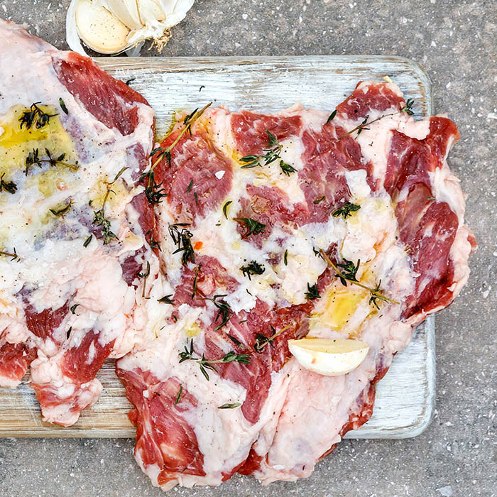 Abanico has so much marbling it has a bit of a bacon-like flavour, but much more complex because of the grasses, herbs and acorns on which the animals are grazed. It should be grilled or cooked in a cast iron skillet at medium high heat.