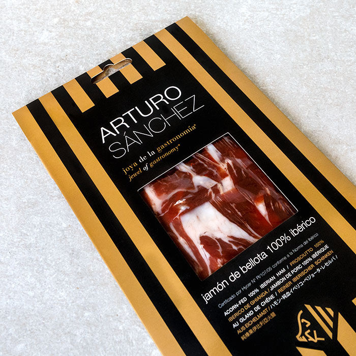 To serve Arturo Sanchez Jamón Ibérico de Bellota, open the pack and allow the ham to breathe for 30 minutes, just like a bottle good wine. Serve on a warm plate so the ham reaches the ideal serving temperature, and the oleic acid gets activated.