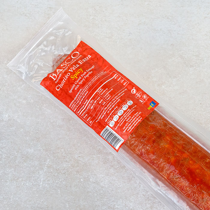 Like Basco Chorizo Vela Dulce, Chorizo Vela Picante is a slicing sausage made in the Rioja region with the same smoky, garlic flavour. However, in the case of Vela Picante the spicy, chili-hot version of the Pimenton de la Vera is used which makes a chorizo sausage with a little more punch and a chili kick. In every other sense the sausage is the same; made by Martinez Somalo, using the thick cuts of pork to make a lean and meaty sausage with that distinctive lush red colour and smoky flavour.