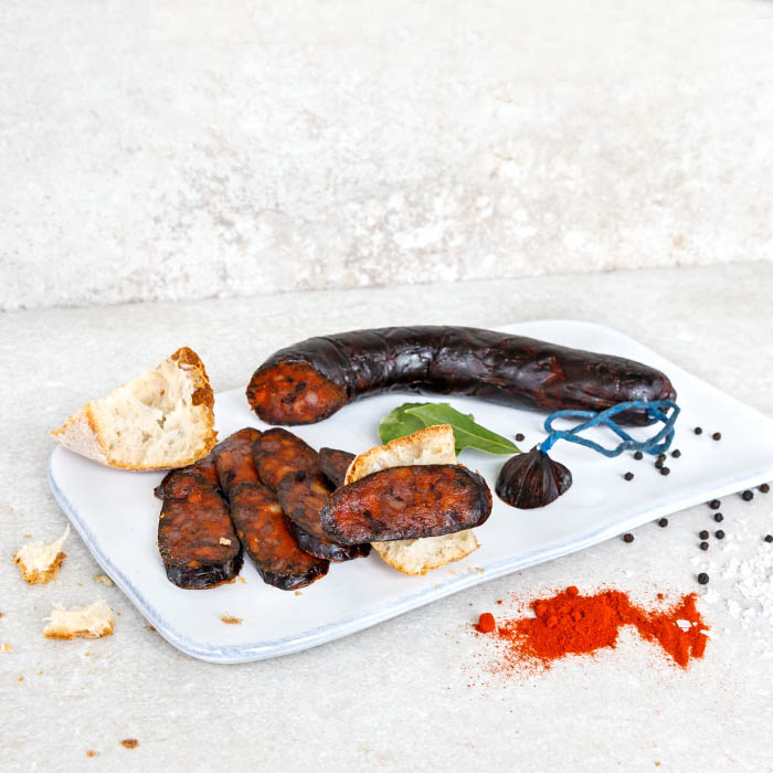 Unlike morcilla de Burgos, this blood sausage does not contain rice so is light and delicate. Perfectly balanced with Iberico pork blood and fat and flavoured with garlic, salt and sweet paprika this sausage is ideal pan-fried or dropped into soups or stews. It is a cured product so can be eaten sliced as part of a cold tapas.