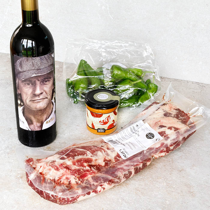 Our presa ibérica pork comes with a bag of padron peppers, ready to blister in a hot pan with Maldon salt flakes and a jar of our spicy mojo rojo sauce that combines perfectly with the rich ibérico pork. The hamper box is carefully paired with a bottle of Matsu El Recio. A bold red wine from Toro, aged for 14 months in new French oak. This wine is a mass of deep black fruit, chocolate, roasted coffee bean and vanilla pod aromas. Voluptuous and weighty, with a firm structure, held together by silky tannins that will round the presa pork perfectly.