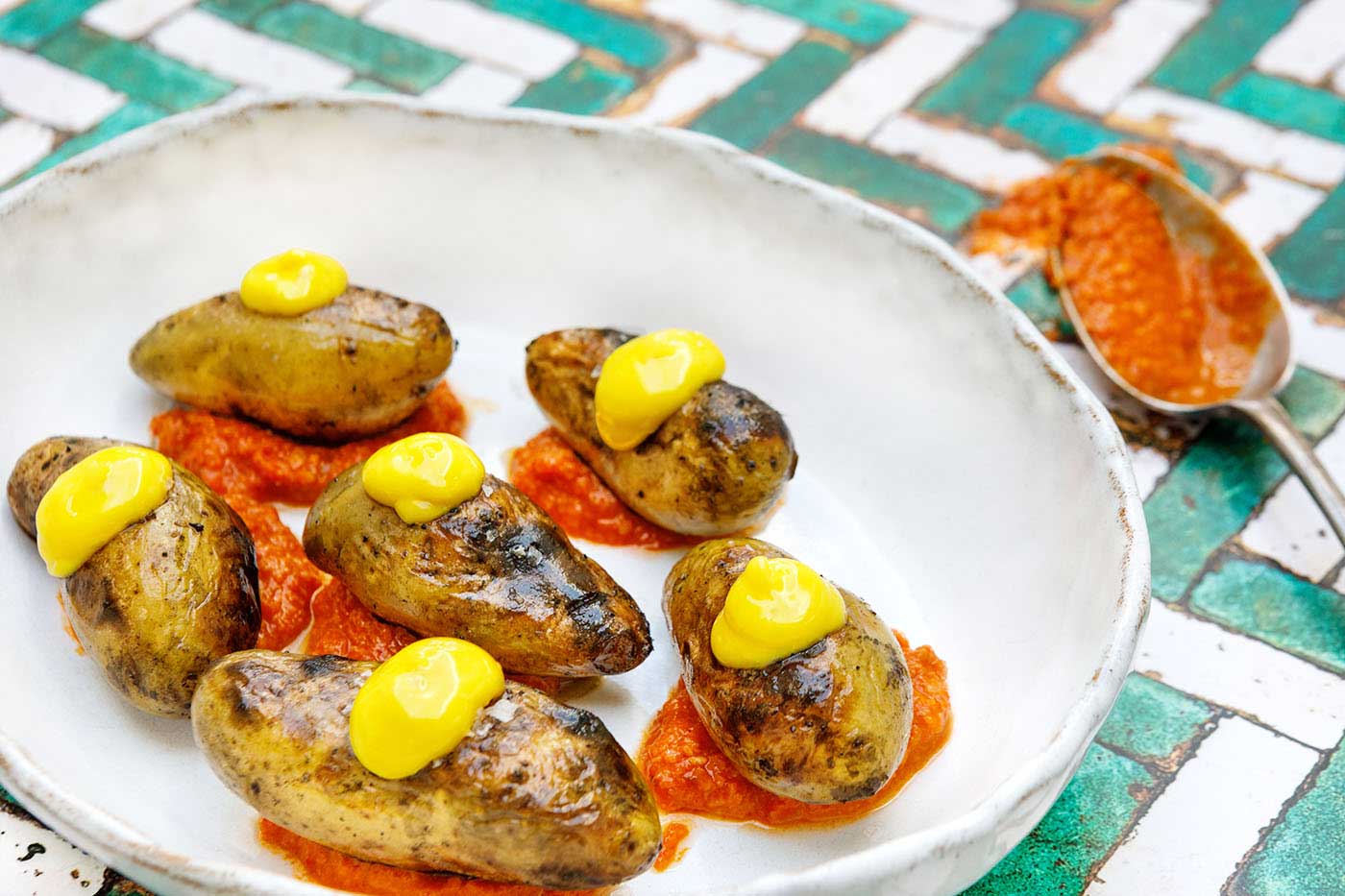 This is a great summer dish that can be served as a side to grilled fish, seafood or any type of meat. You can part-boiled the new potatoes and make the sauces in advance, so you only need to barbecue the potatoes and you ready to serve.