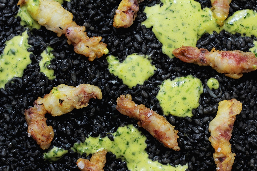 Squid ink rice dishes are very popular in Spain. They work really well when served with king prawns, fresh squid or roasted fish such as monkfish or turbot. In this dish I also use tiny baby squid, which is also a very popular ingredient in Southern Spanish cuisine. They are called ‘chopitos’ or ‘puntillitas’ depending where you are. They tend to be very small, so the best way of serving them is to coat them in harina de freir, a special Spanish frying flour and quickly fry them until golden brown. This recipe shows you how to cook the black rice as a risotto dish, adding the stock ladle after ladle until the rice is cooked al dente. The earthy flavour of the black rice pairs really well with the crunchy fried squid pieces and the herby aioli. The vibrant colours of this dish will also impress any dinner guests.