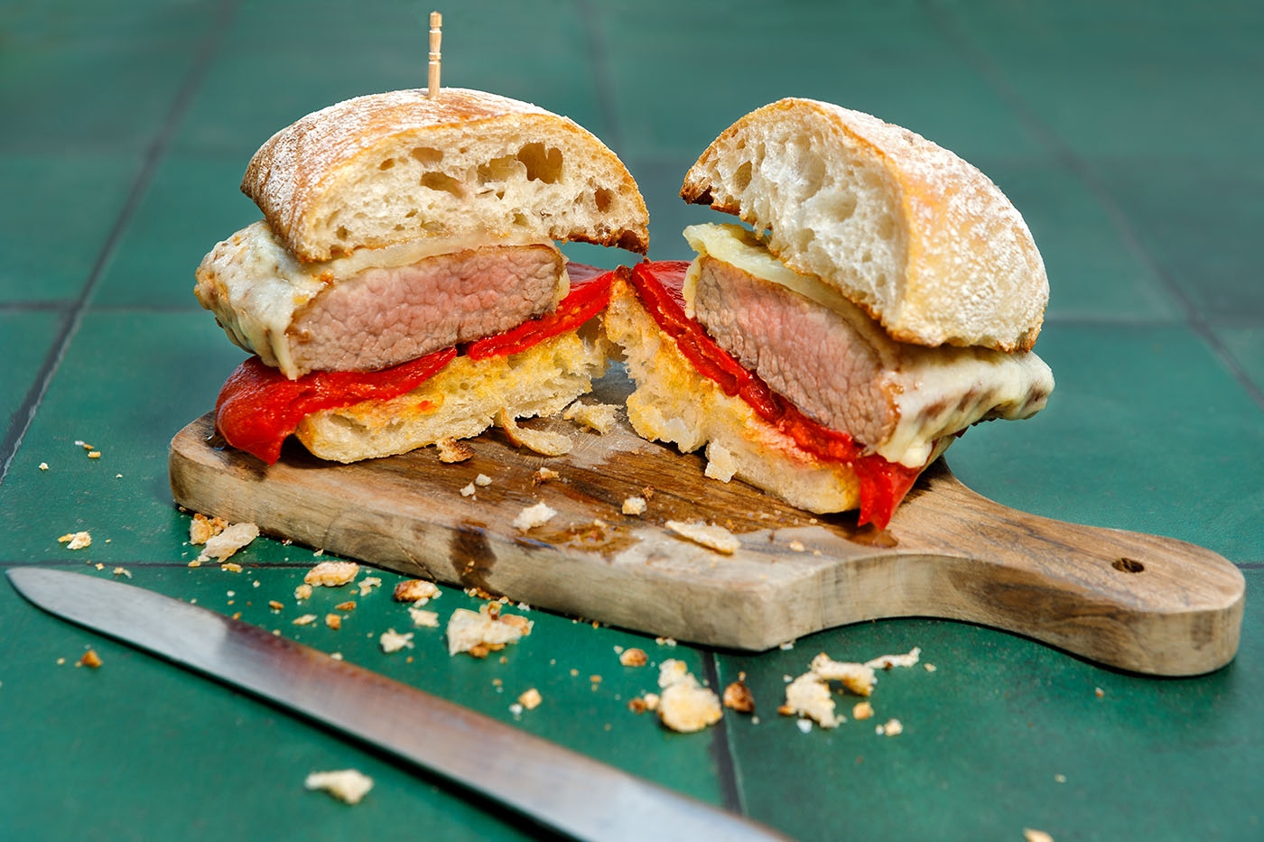 This is a traditional Spanish bocadillo that uses thin slices of grilled pork loin served with melted cheese and red peppers. In my version of Bocadillo de Lomo, I have substituted the pork loin with delicious secreto ibérico pork and used cured Manchego cheese for a punchier flavour that works well with the sweet confit piquillo peppers.
