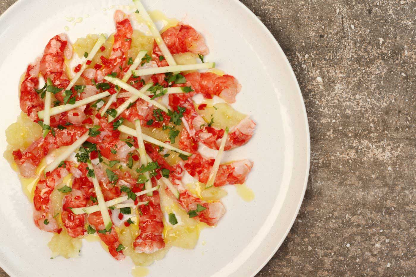 Carabinero prawns work so well in a ceviche. The prawns have such a beautiful sweet flavour that they balance so well when you marinate them in lime juice. In this dish I serve them with some pink lady apple puree, fresh granny smith apple, chopped coriander, chilli and a drizzle of lemon infused olive oil for a tasty and delicate start to a meal.