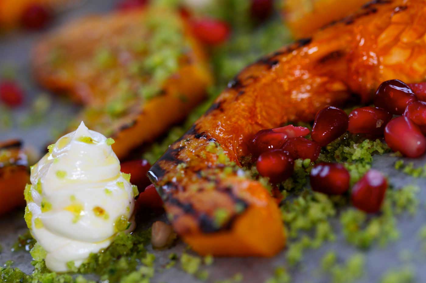 Chargrilled Butternut Squash with Goats Cheese Cream, Pomegranate and Pistachio Migas