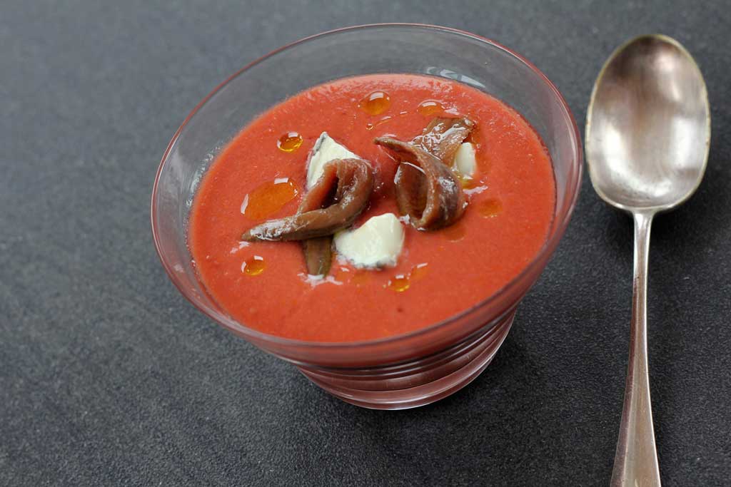 Flavoured gazpachos are becoming more popular in tapas bars and restaurants in Spain. In this recipe, I add to the basic gazpacho mix of tomatoes, green pepper, onion and garlic, some fresh cherries which provide a touch of sweetness to the soup. Make sure you make the gazpacho in advance and chill it in the refrigerator. The flavours will blend better and provide the soup with more depth and colour. The garnish for this gazpacho is a bit unusual but it works. Some creamy goat’s cheese will work really well with the sweetness in the soup, whilst the salty anchovies provide depth to the dish.