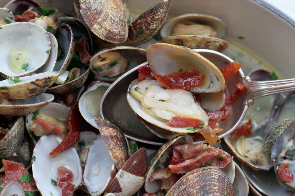 I LOVE this recipe. The flavoured ham oil coats the clams beautifully and acts as a seasoning agent, whilst the fino sherry brings the whole dish to life. I love cooking with sherry and this is a simple example of how well sherry tastes in sauces. You can use dark sherries such as amontillado and oloroso on roasted meats, dark gravy sauces and marinades whilst fino and manzanilla sherries work well with seafood and creamy sauces. The creamy but full bodied flavour from the fino sherry, contrasts incredibly well with the sweet clams and salty iberico ham. An easy tapas dish, that looks good and tastes better.