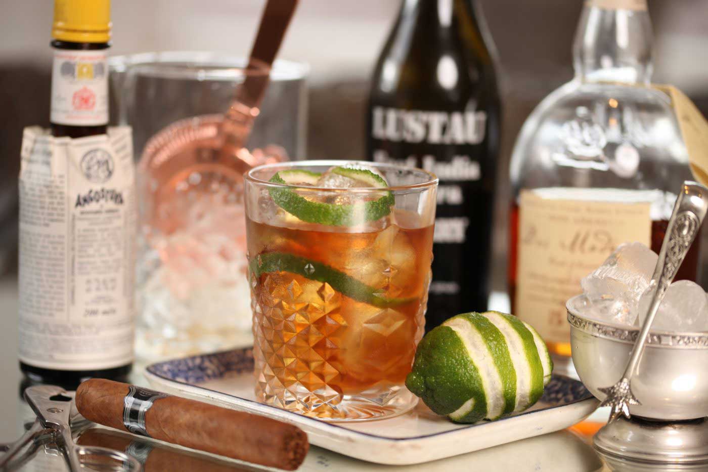 Now that sherry is relatively well understood and publicised, more contemporary cocktail menus should experiment with sherry cocktails. There is a wide range of sherry wines that carry a broad range of flavours and textures from the brightly acidic Fino and Manzanilla to the syrupy, rich Pedro Ximenez sweet sherry. The Dunlop, as listed in the Savoy, calls simply for rum, fortified wine, and Angostura bitters. My recipe uses a Spanish rum called Dos Maderas, a blended 5-year-old rum aged for a further three years in ex-sherry casks, giving the finished product a wonderful sweetness and depth. I complement the rum with a shot of rich, toffee-flavoured Lustau East Indian Sherry, brightening the whole drink with a lime twist. This is a sit back, relax and enjoy kind of cocktail.