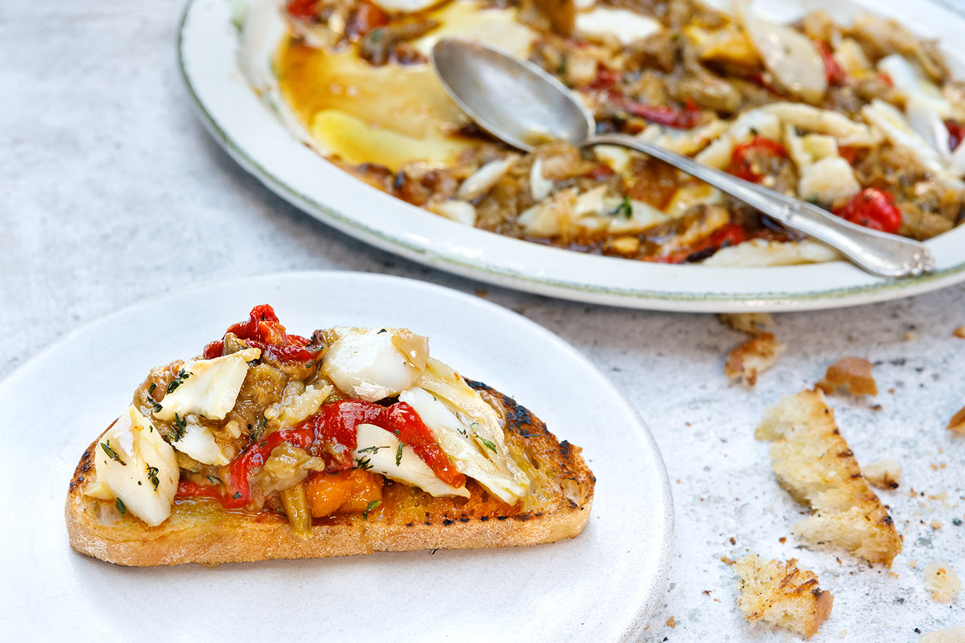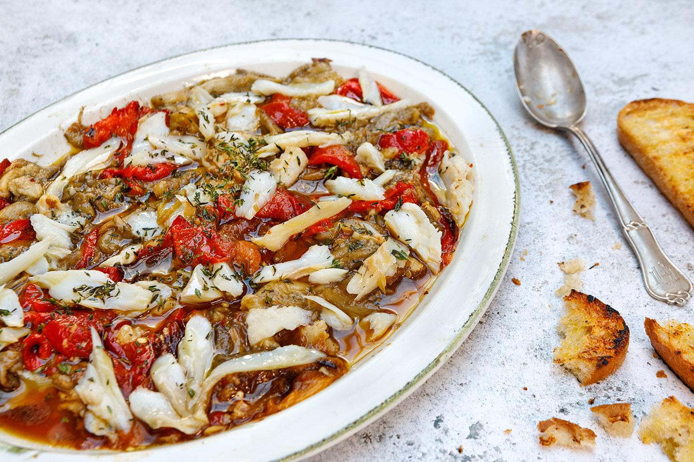 4. Place the salt cod loin fillets in a pan with an inch of water, cover and cook gently for 5 minutes, allow to cool down before flaking the fillets. Mix the salt cod flakes with the roasted vegetables, season with salt, freshly chopped thyme and a good drizzle of olive oil. Serve with toasted bread and a chilled glass of sparkling cava.