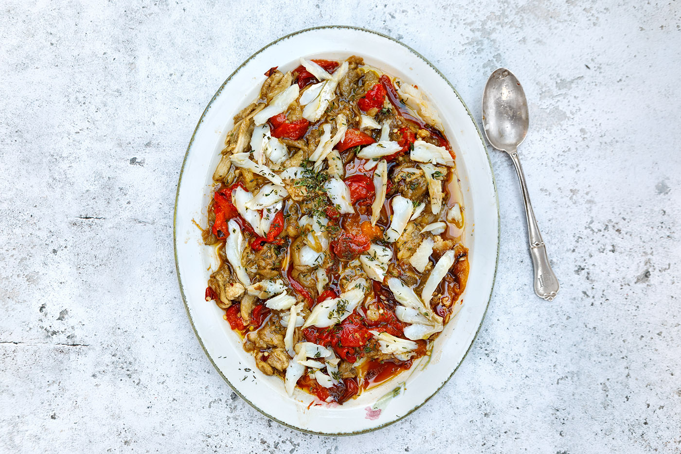 Espencat is a traditional dish from Valencia made from red peppers, aubergines, garlic and salt cod. The peppers and aubergines are roasted in a hot oven or barbecue until the skins are well charred, they are then peeled and cut into fine strips before mixing with flakes of salt cod. The dish is then dressed in olive oil, season with salt and herbs. Espencat is usually served at room temperature during the summer with toasted bread.