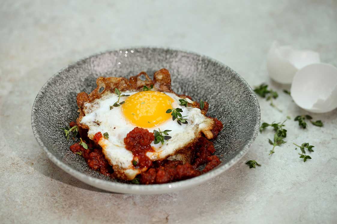 Because of their balmy semi-tropical climate, islanders in Mallorca and Menorca are unable to fully dry-cure their meat, as is done on mainland Spain. Instead, they preserve their meat by mixing it with a local type of paprika and age it for a short time. The result is sobrasada, a unique cured sausage that has a soft-spreadable texture which is ideal for cooking or as a spread. In this recipe, I fry the sobrasada sausage before spreading it on toast and topping it off with a crispy fried duck egg for a quick and tasty brunch dish.