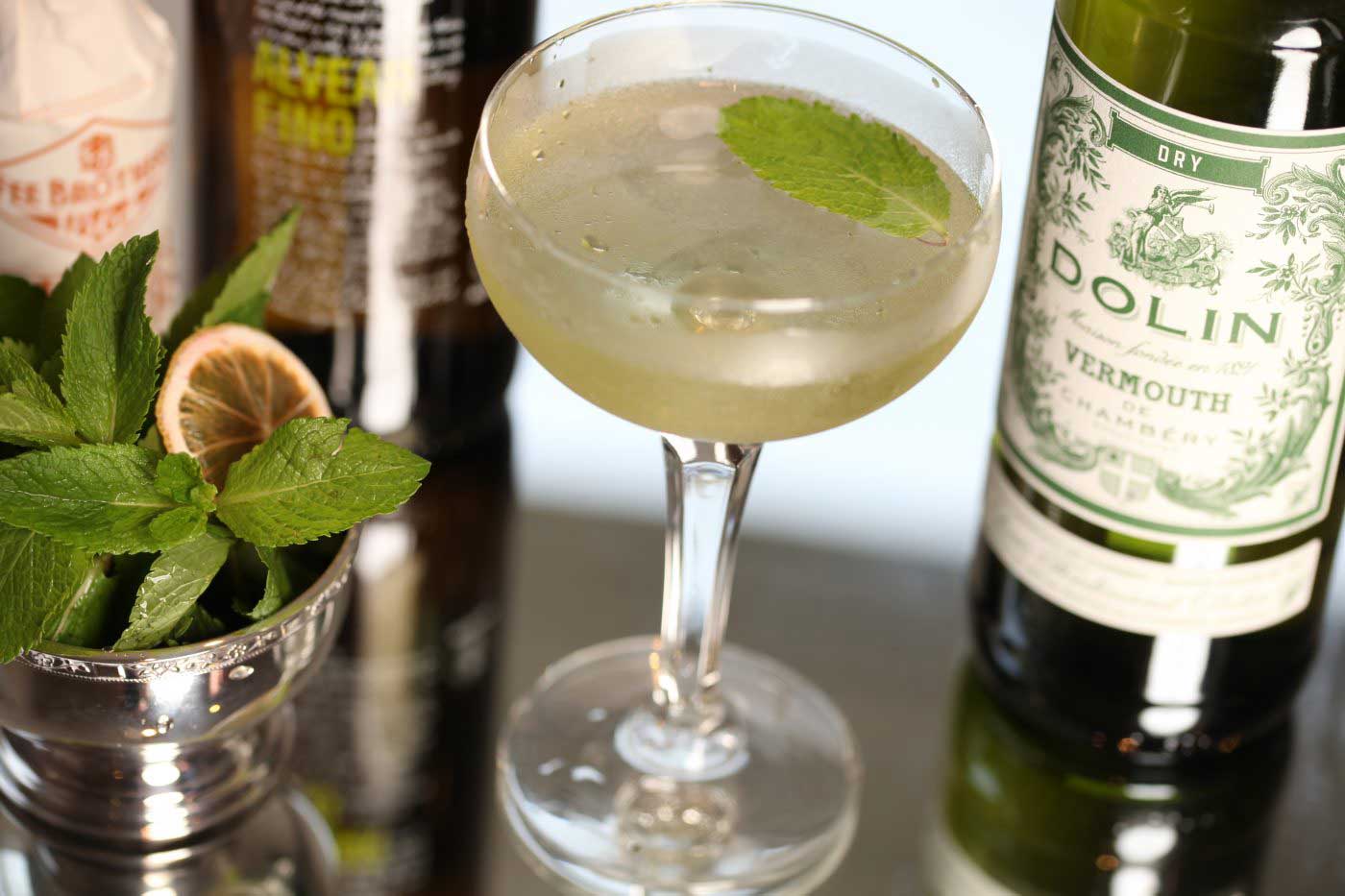 The Greenbriar Sherry Cocktail is not a Julep but a sherry and dry vermouth version of the gin based Derby Cocktail with the inclusion of fresh mint and peach bitters.
