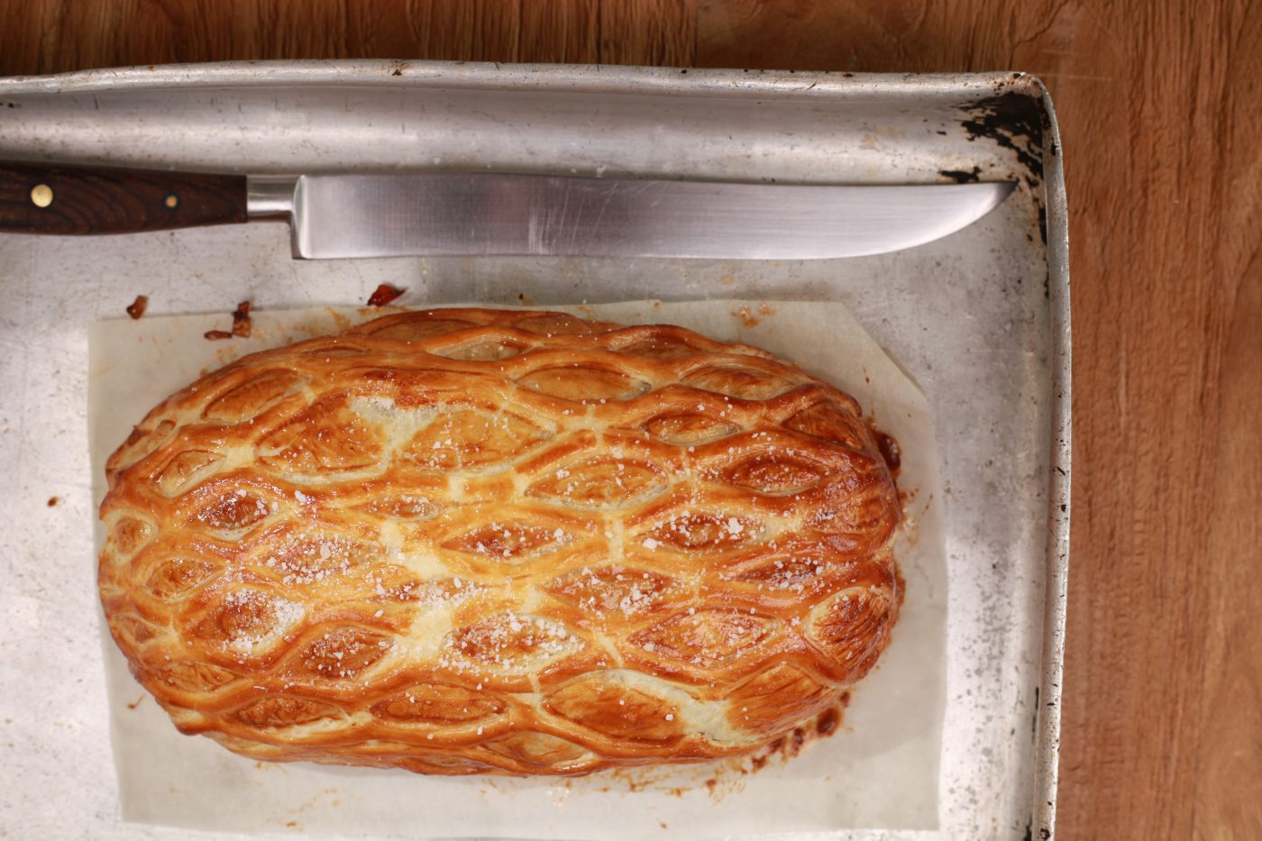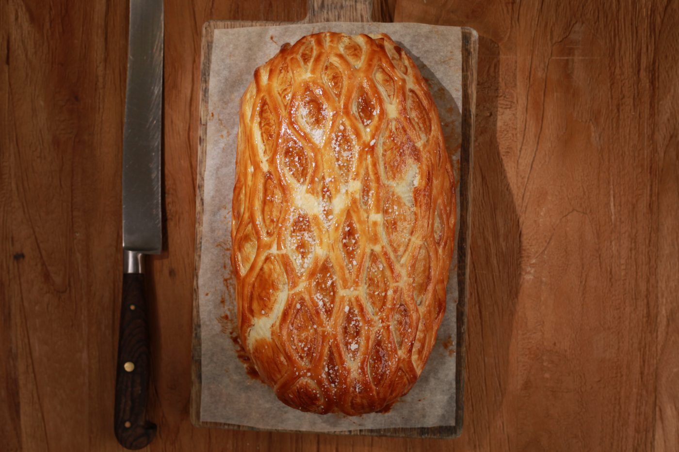 7.  Sprinkle your wellington with some sea salt and bake until golden and crisp – 30 to 35 minutes for medium-rare, 40 to 45 minutes for medium; if the pastry appears to be browning too quickly, lower the oven heat slightly. Leave the wellington to rest in a warm place for about 15 minutes before cutting into thick slices and serve with your choice of side orders and gravy.