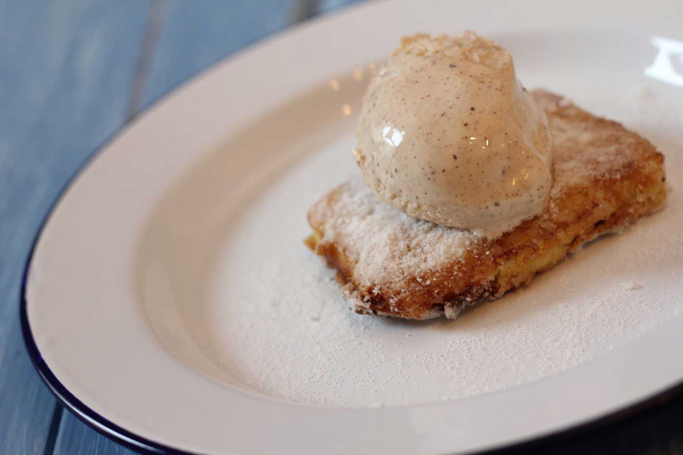 Leche frita (fried milk) is a Spanish dessert typical of the North of Spain and traditionally served during Easter. The milk fritter is a sweet custard, set in the fridge overnight, cut into squares, fried like a doughnut and finished with a dusting of sugar. My grandmother used to like serving this dessert every Easter Sunday so I have a fond memory of it. I like to make the custard not too thick so when you fry it and cut into it, it begins to melt. I like to serve my version with homemade cinnamon ice cream.