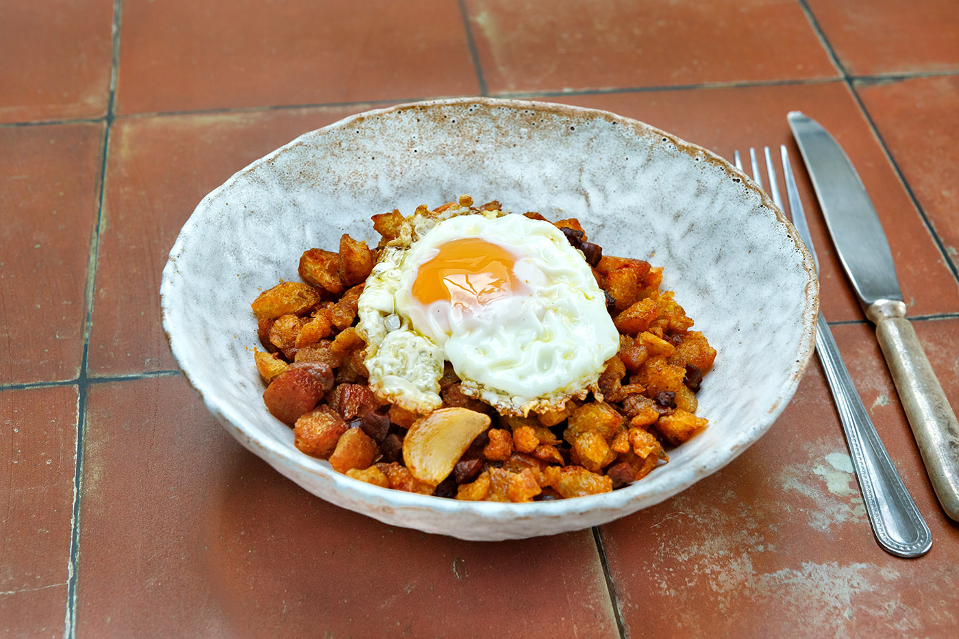 Migas Manchegas are a traditional dish from La Mancha using basic ingredients that shepherds could carry: stale bread, pancetta and chorizo. Migas which translates to breadcrumbs are lightly fried bread cubes tossed in garlic, smoked pancetta, chorizo sausage and choricero pepper puree and typically served with green grapes to cut through the robust flavour of the dish. A fried egg is also a perfect topping to migas manchegas, so you can dip the crispy crumbs in the runny egg yolk.