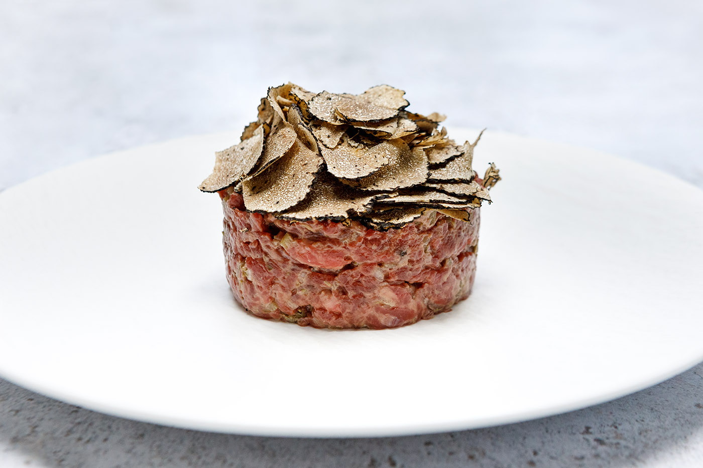 A powerful beef tartare recipe made from rump of aged ox beef by El Capricho restaurant. The beef is hand diced and made into a classic tartare with ultra fine diced shallots, capers, Dijon mustard, tabasco, Worcester sauce, salt and black pepper and finished with fine slices of black summer truffle.