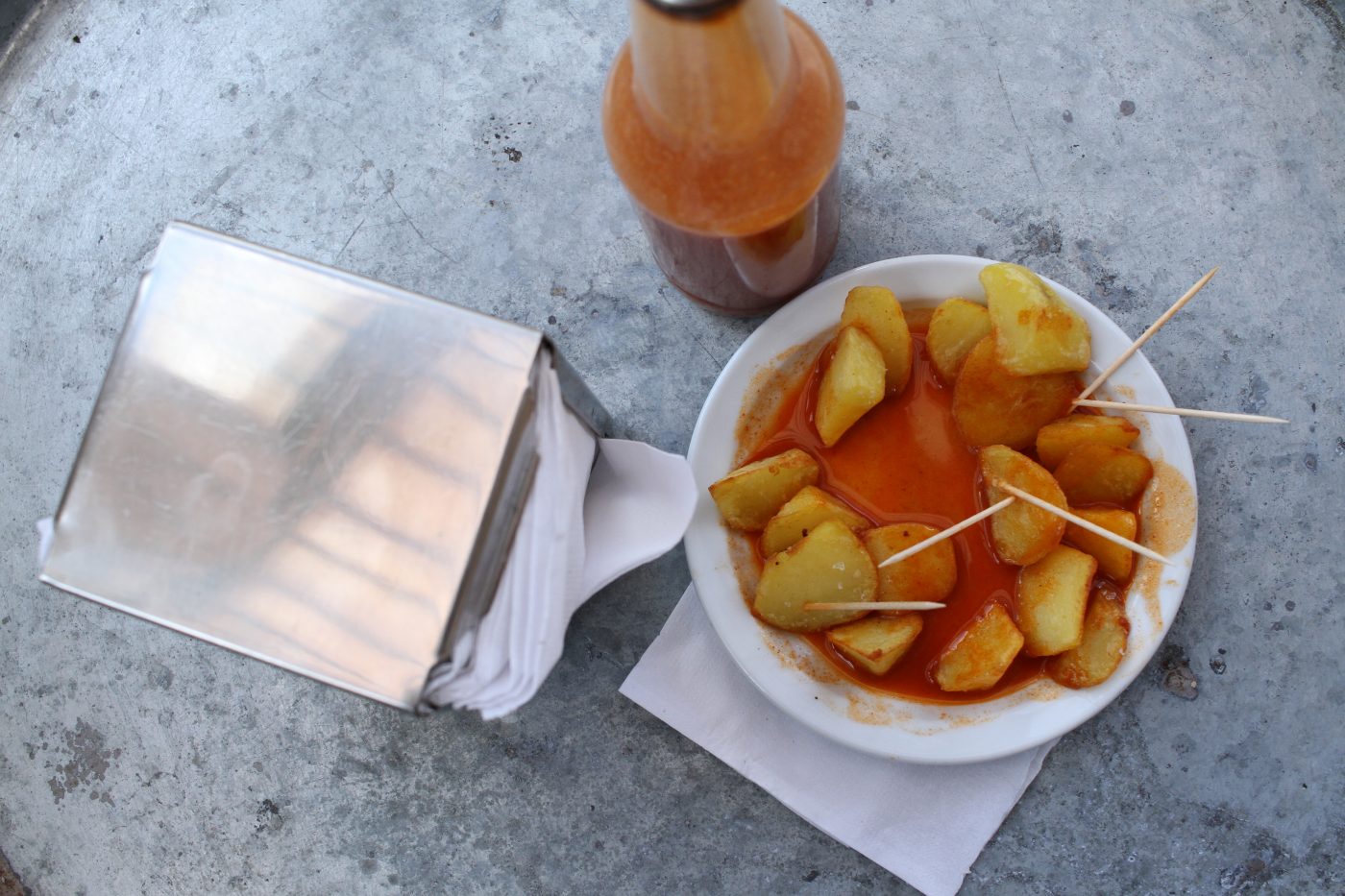 Patatas bravas are probably the most popular tapas dish in the world but being truthful a lot of Spanish bars and restaurants in the UK get it so wrong when preparing them. In Spain, purists of bravas see Madrid as the mecca or capital of patatas bravas and in particular, a bar called Docamar located in Quintana, who have specialised in these fiery fried potatoes for over half a century and sell over 1.5 tonnes of potatoes every weekend.The two key ingredients to a good plate of patatas bravas are the potatoes and the bravas sauce. Always use fresh potatoes and choose a variety that is neither too wet nor too dry. I tend to use Russet or Maris Piper. A potato that is too wet has a low solids content and will tend to have a waxy, soggy texture when fried. Potatoes that are too dry tend to be too hard and crunchy when fried. The potatoes are always cut into irregular chunks of about 1 to 1.5 inches and fried in two stages. The first stage is on a low heat to cook the potatoes and the second stage is on a high heat to brown them on the outside and make them crispy. Authentic bravas sauce is not fully made out of a spicy tomato sauce but instead it is made from a velouté sauce made with onions, garlic, spicy paprika, flour, fresh tomatoes and chicken stock. The sauce needs to be spicy but without being too hot. It can be made in advance and served in a bottle, just like Docamar do, so your guests can pour as much or as little bravas sauce as they want. You can also make it in advance and freeze it.