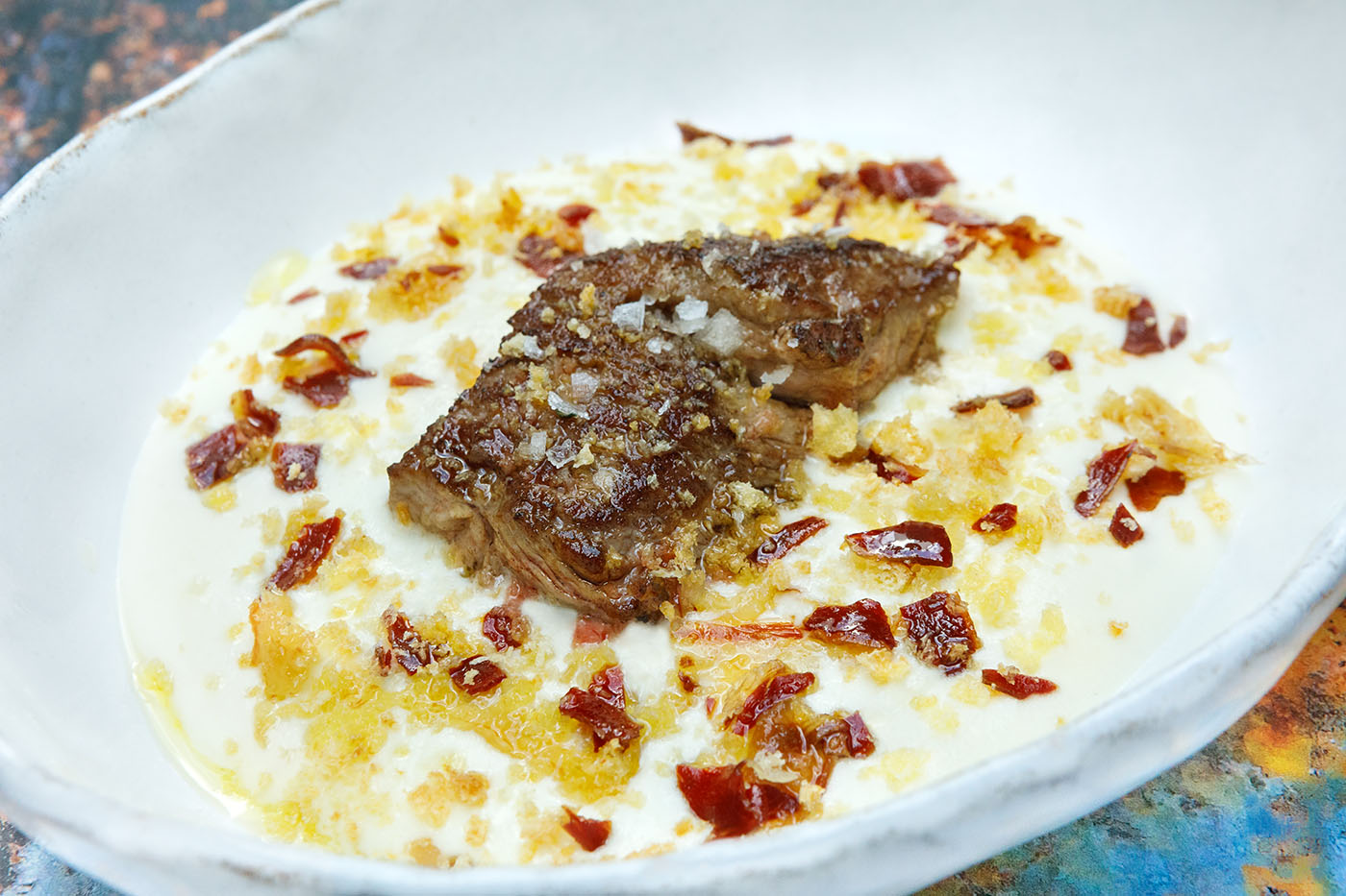 In this Pluma Ibérica recipe, I pair chargrilled ibérico pluma pork served on a bed of truffle infused potato foam, sprinkled with crispy ibérico migas made with dried jamon ibérico mixed with fried sourdough breadcrumbs. The fatty pork pairs incredibly well with the creamy potato foam and the crispy breadcrumbs lift this dish to another level.