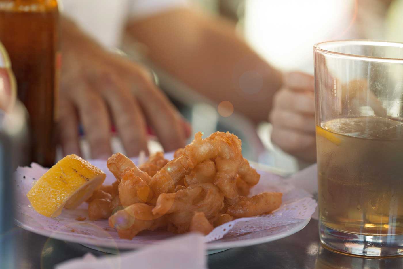 Spanish fried squid in a golden batter is a classic Sunday pintxo called rabas. The trick is to make the batter the day before and not to overcook the squid or it will become rubbery. Rabas are best served with a good squeeze of lemon and a cold beer.
