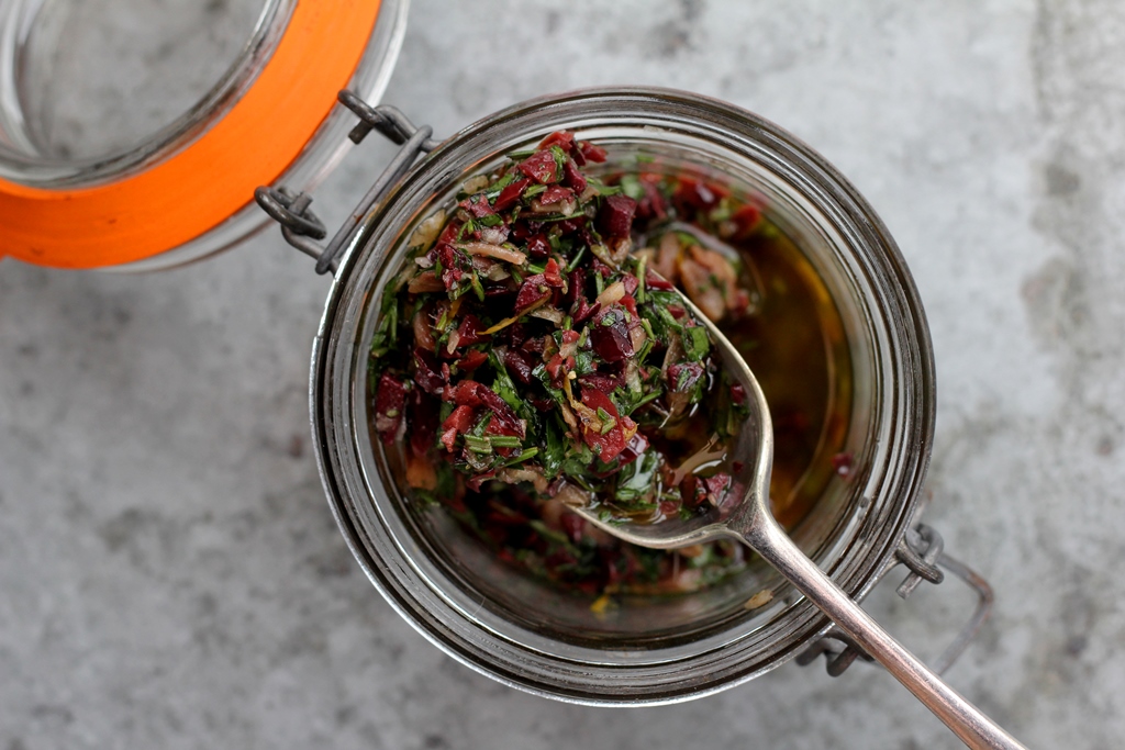 7. Just before serving, spoon the fresh black olive and anchovy salsa on top the lamb.