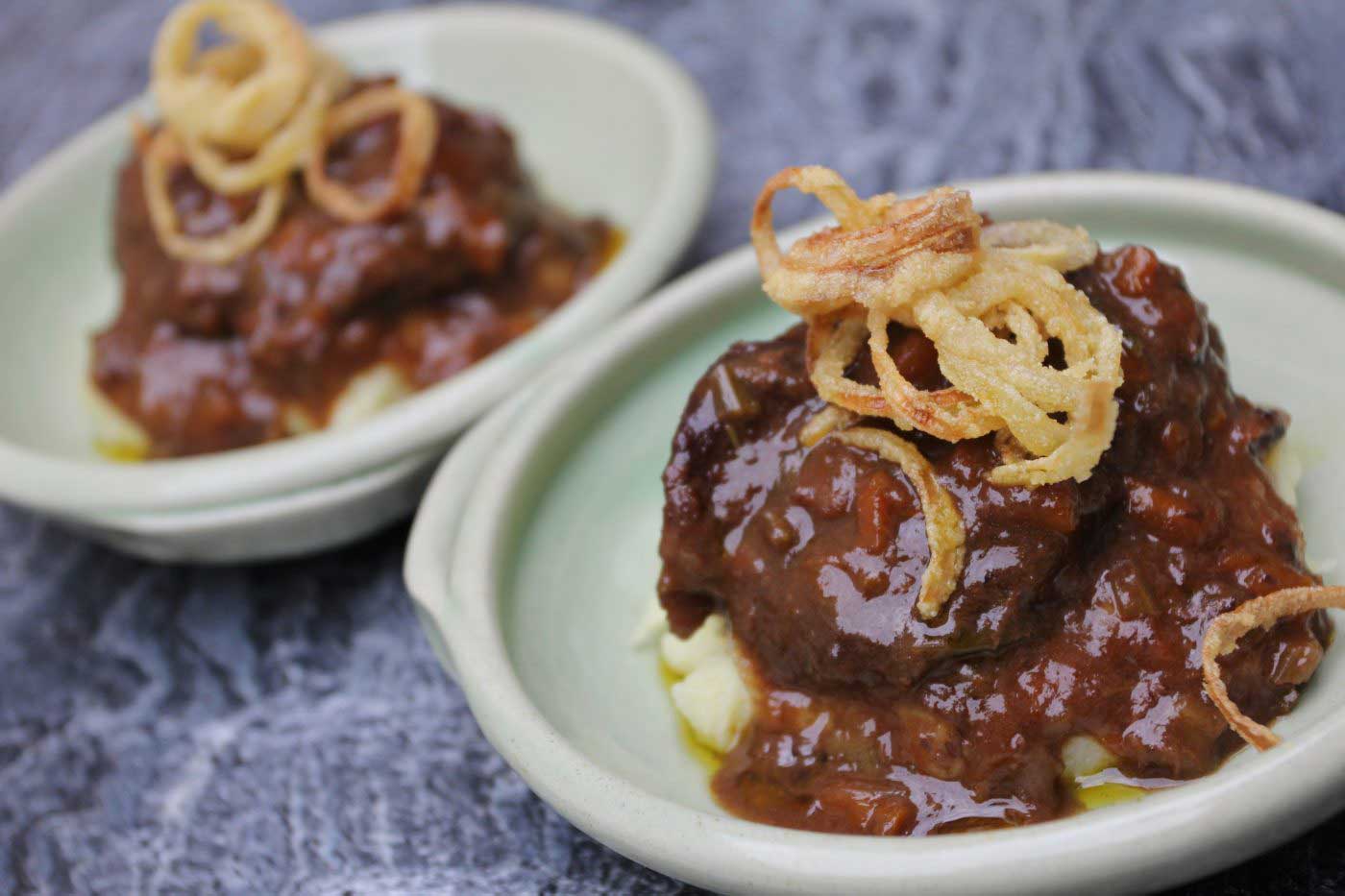 9. To serve, put a spoonful of the mash potato in a serving bowl, place the pig cheeks on top and spoon over the sauce. Sprinkle with some fried shallot rings.