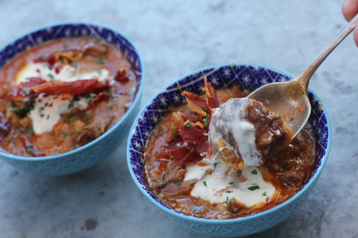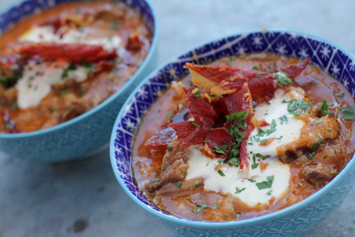 Take a classic sopa de ajo to another level by adding some slowly braised pork cheeks, sour cream and crispy serrano ham. The shredded pork cheeks work well with the earthy flavour of the sopa de ajo, whilst the silky sour cream provides freshness and creaminess against the salty ham. This is a full-on winter soup with no calorie target, comfort food at its best. Enjoy with a chilled glass of mencia red wine and some crusty sourdough bread.