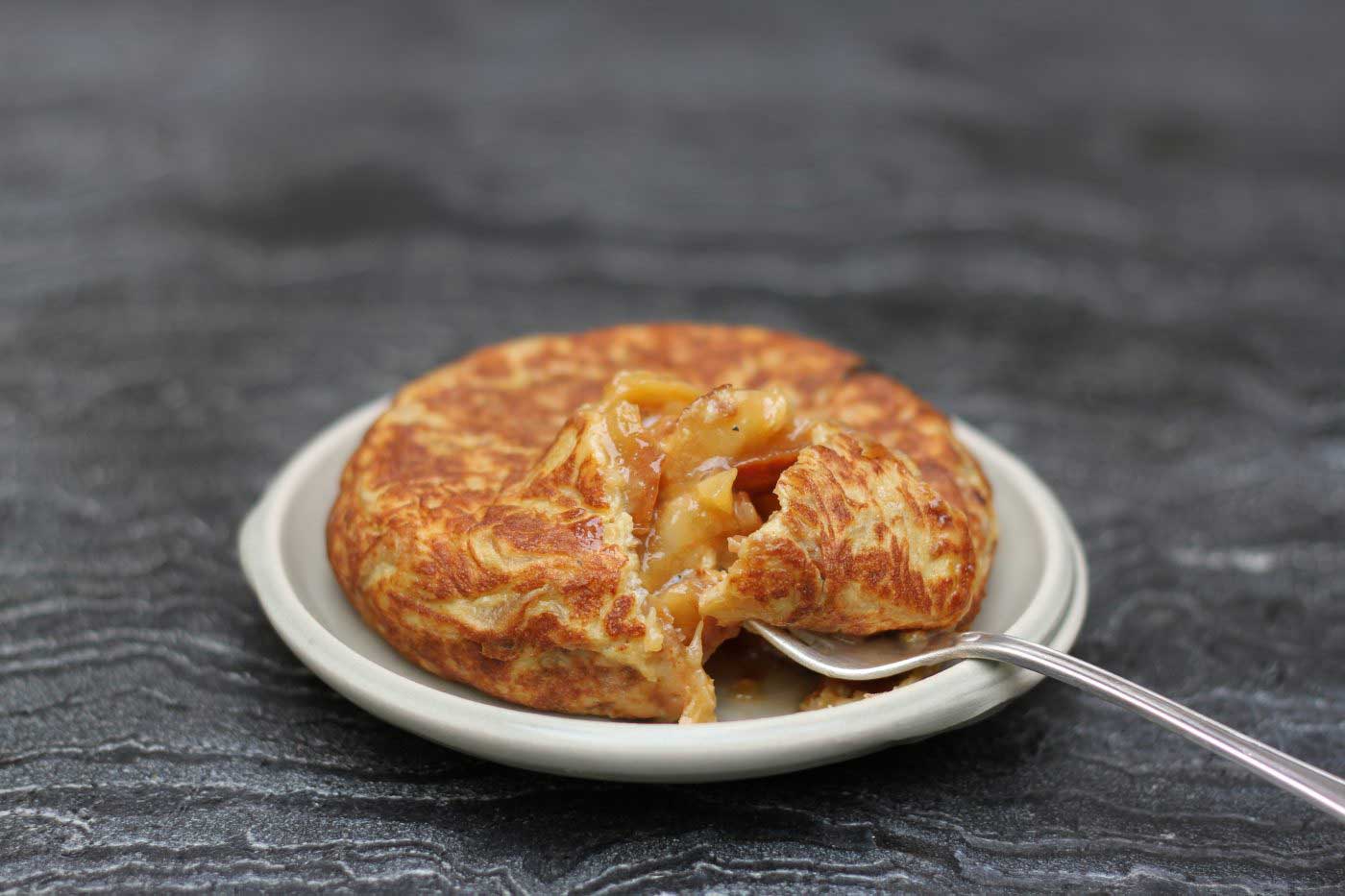 For an extra tasty Spanish omelette, caramelise some onions and lightly cook the mixture with the potato and onion mix. This will keep the omelette moist and not dry. You can also add other ingredients to the omelette, such as piquillo peppers and prawns, wild mushrooms and cheese, ham and tomato and anything that you can think of! I really like to make my tortilla using a small blinis pan to make individual fluffy omelettes. This recipe makes two small omelettes or one medium one.
