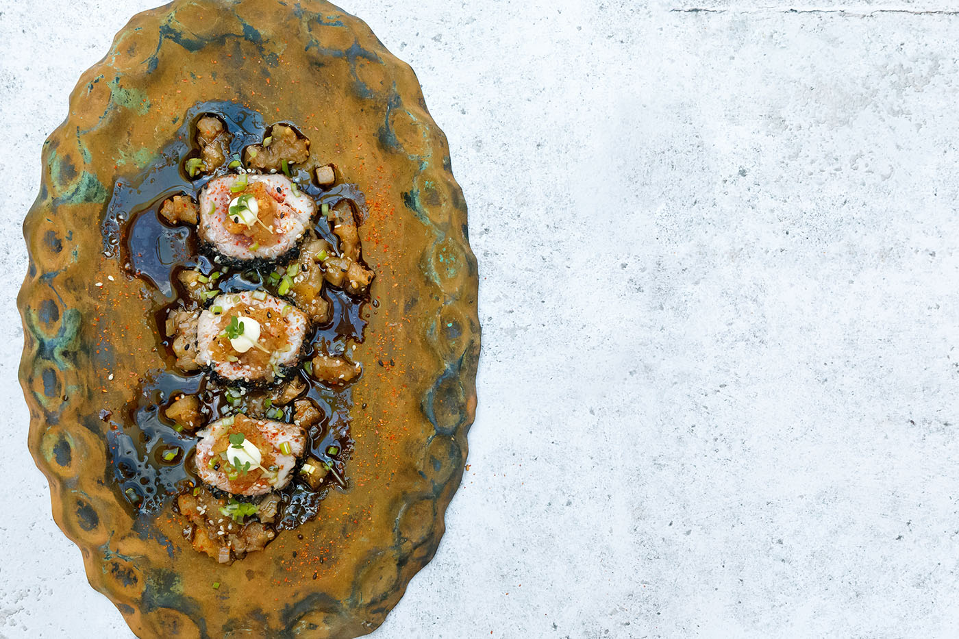 Everyone knows that pork and apple are a winning combination but as a pork tataki? This is an unusual way to serve pluma ibérica that I first saw in a Japanese restaurant in Madrid. The pluma pork is seared on all sides, brushed with Japanese mustard and rolled in toasted sesame seeds before marinating it overnight. The pork is then sliced thinly and served on a bed of spiced apple chutney and a drizzle of tangy yuzu mayonnaise.