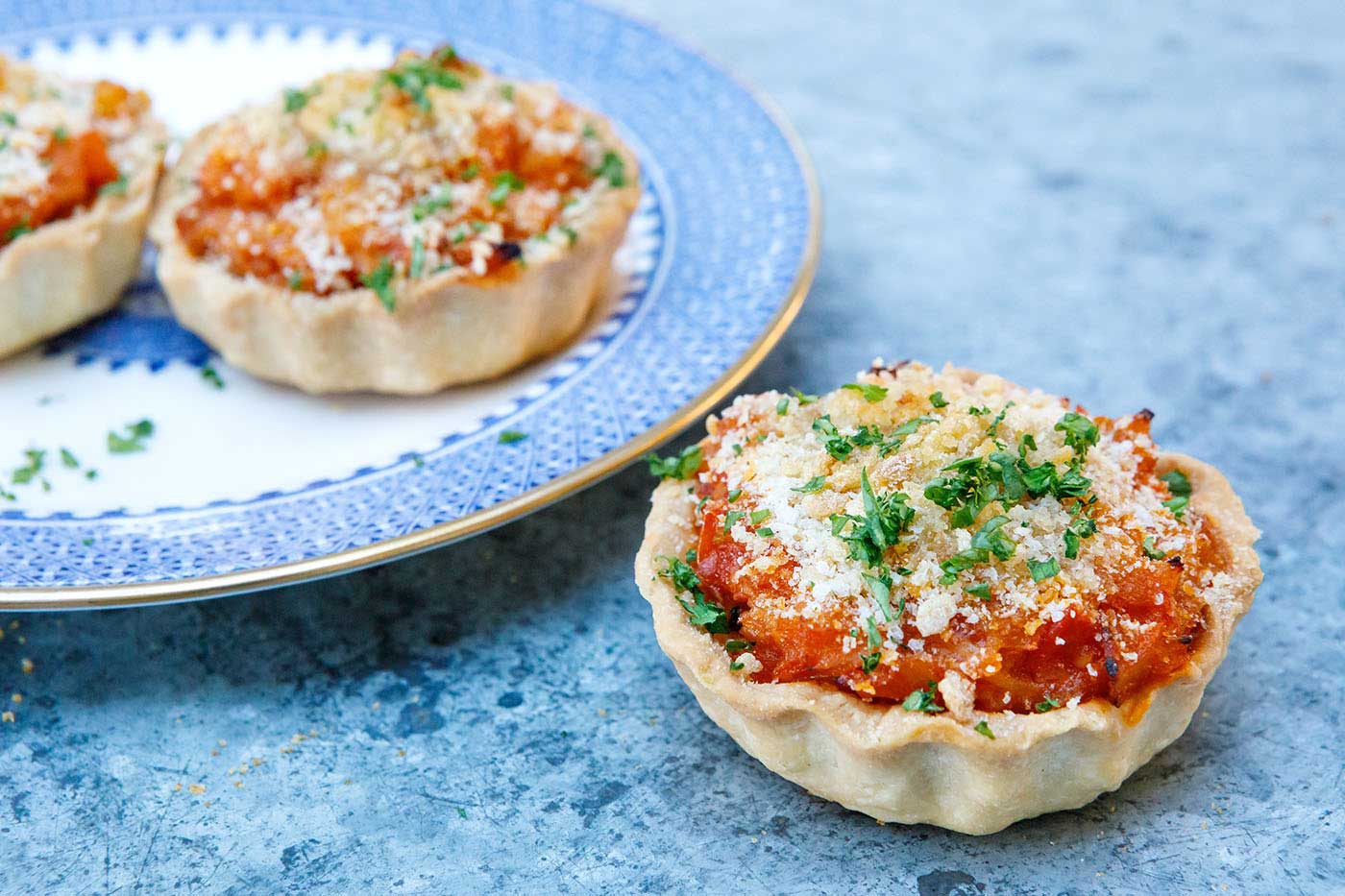 Based on the traditional San Sebastian dish called Txangurro a la Donostiarra, these little tartlets are a delicious pintxo to serve as a pre-dinner canapé. The sauce is made from crab meat slowly cooked with shallots, leeks and tomatoes and flambé with Cognac. The mix is then spooned into the crispiest of tartlets made from pâte à foncer pastry and baked under a hot grill.