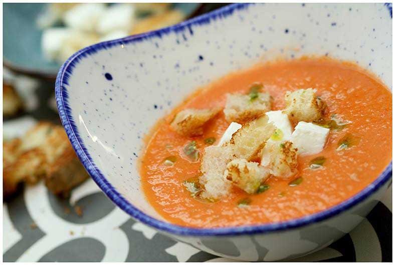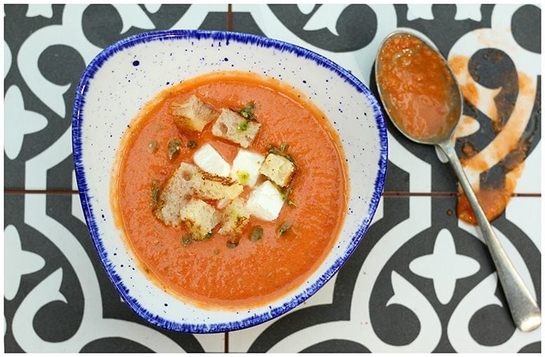 I love using fresh fruit in gazpacho soups. In this recipe, I use fresh watermelon for a fruity and refreshing touch to this classic Spanish cold soup. This recipe is the ideal summer starter when you have guests and a barbecue on the go. You can make the soup the day before and store it in the fridge. This will help the flavours in the soup to blend better. Serve it really cold and garnish with some chopped feta cheese, watermelon, toasted croutons and a drizzle of basil oil. You can also add other ingredients such as crab meat with chopped avocado or thinly sliced ibérico ham with chopped hard-boiled egg.