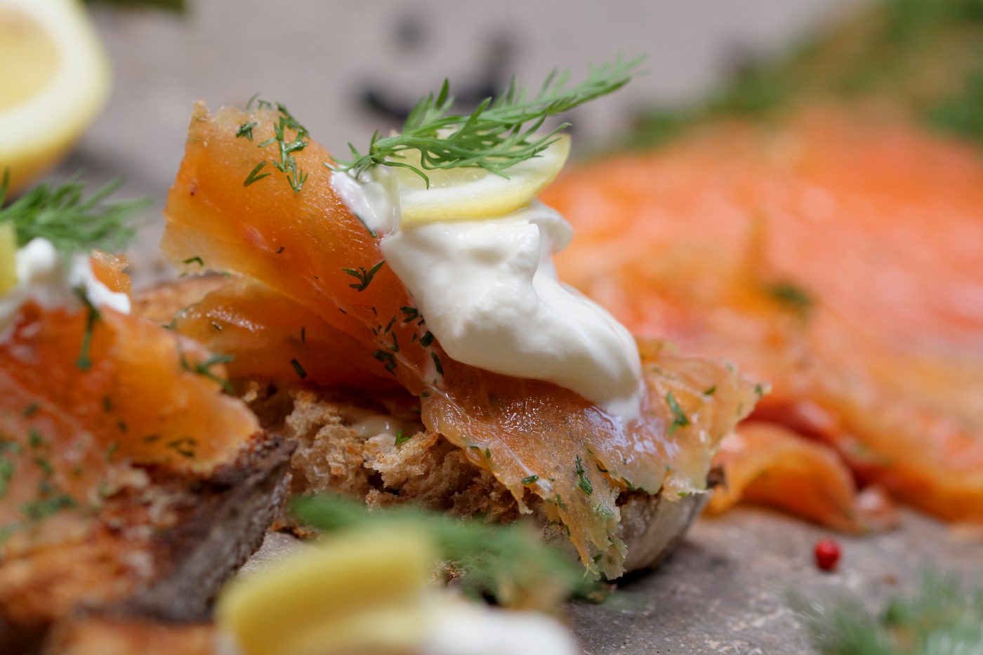 3. To serve, unwrap your gin cured salmon and wipe all the salt mixture off. Pat dry with a kitchen towel and sprinkle with some finely chopped dill. Thinly slice your salmon and serve with pickled onions, sour cream, lemon wedges and toasted sourdough bread.