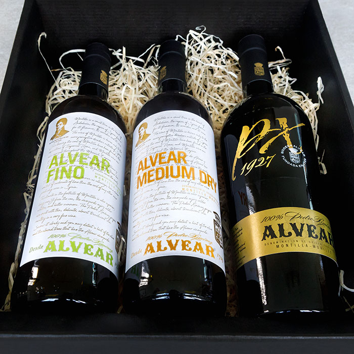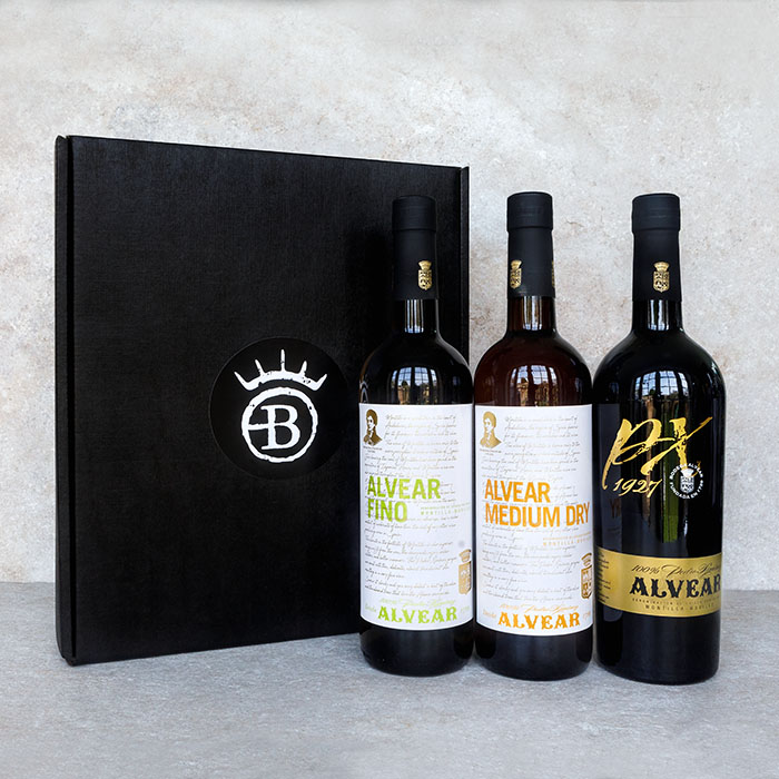 The trio includes one bottle of Alvear Fino, perfect pairing to Spanish Hams, olives and fried fish, one bottle of Alvear Medium Dry, a medium style fortified wine great with savoury or sweet foods and a bottle of Alvear PX 1927 our sweet Pedro Ximenez ideal with desserts, coffee or just poured over ice cream.